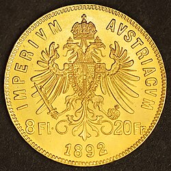 | 8 Gulden = 20 Franken | 21 mm | 6,451 g 900 ‰ Au, 100 ‰ Cu | „VIRIBVS VNITIS“ | „IMPERIVM AVSTRIACVM“, Adler, Jahr der Prägung, Wert | „FRANCISCVS•IOSEPHVS•I•D•G•IMPERATOR•ET•REX“, Franz Joseph I. | 1870–1891 | |||
