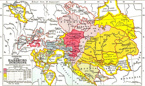 Wie das spanische, war auch das im östlichen Mitteleuropa gelegene habsburgische Länderkonglomerat im Wesentlichen durch eine geglückte Heiratspolitik entstanden, wurde aber seit dem ausgehenden 17. Jahrhundert durch Eroberungen auf Kosten des Osmanischen Reichs wesentlich erweitert. Seit Ferdinand I., einem Bruder Karls V., wurde es von der österreichischen und seit Ferdinand II. von der innerösterreichischen Linie der Dynastie regiert. Diese trägt seit der Heirat Maria Theresias, der Tochter des letzten männlichen Thronerben, mit dem Herzog von Lothringen und späteren Kaiser Franz Stephan den Namen Habsburg-Lothringen.