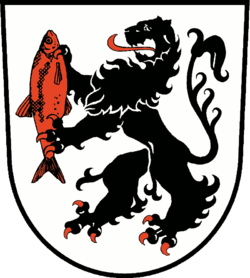 Blasonierung: „In Silber ein aufgerichteter rotbewehrter und rotbezungter schwarzer Löwe, in den Vorderpranken einen aufrechten roten Fisch haltend.“