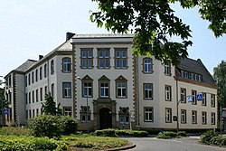 Die Fassade wird durch risalitartige Bauteile mit Sandsteingliederungen und Ziergiebel betont. Durch die Kriegseinwirkungen während des Zweiten Weltkrieges wurde das Gebäude im Dach- und Fassadenbereich erheblich beschädigt. Die Reste der stark zerstörten Giebel wurden beim Wiederaufbau entfernt und einfach mit einem Dachabschluss versehen.