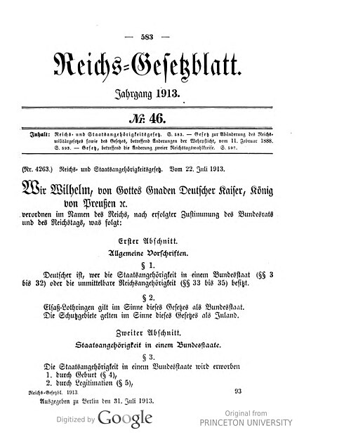 Titelseite des Reichs- und Staatsangehörigkeitsgesetzes von 1913
