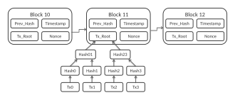 Bei Bitcoin besteht eine Blockchain aus einer Reihe von Datenblöcken, in denen jeweils eine oder mehrere Transaktionen zusammengefasst und mit einer Prüfsumme versehen sind, d. h., sie werden jeweils paarweise zu einem Hash-Baum zusammengefasst. Die Wurzel des Baumes (auch Merkle-Root, bzw. Top-Hash genannt) wird dann im zugehörigen Header gespeichert. Der gesamte Header wird dann ebenfalls gehasht; dieser Wert wird im nachfolgenden Header abgespeichert. So wird sichergestellt, dass keine Transaktion verändert werden kann, ohne den zugehörigen Header und alle nachfolgenden Blöcke ebenfalls zu ändern.