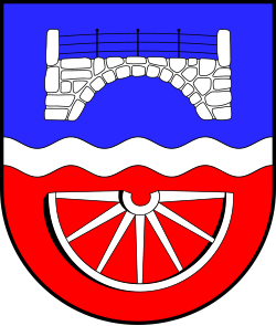 Blasonierung: „Von Blau und Rot durch einen silbernen Wellenbalken geteilt. Oben schwebend eine aus unbehauenen Granitsteinen gemauerte, oben mit einem Eisengeländer abschließende silberne Brücke, unten ein schwebenden, unterhalbes silbernes Wagenrad.“