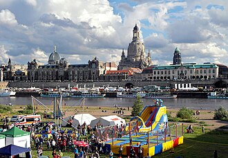 Blick über die Elbe zur Brühlschen Terrasse, von links: Albertinum, Kunstakademie, Sekundogenitur, Ständehaus. Im Hintergrund die Frauenkirche.