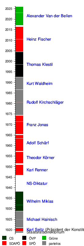| 9 | Alexander Van der Bellen | * 1944 | (nach Wahlwiederholung) 26. Jänner 2017 | unabhängige Kandidatur (bis Mai 2016 Mitglied der Grünen) | ||