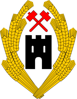 | Weitere Elemente | Mauerkrone auf dem Adlerkopf, Hammer (linker) und Sichel (rechter Fang), die Fänge umschließende gesprengte Kette |