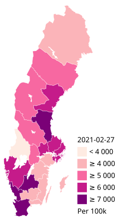 Bis zum 15. März gab es in Schweden 1190 bestätigte Fälle, wobei der Landkreis Stockholm am stärksten betroffen war. Am 26. März hatte sich die Zahl auf 2840 bei 71 Toten und sechzehn als geheilt geltenden Personen erhöht.