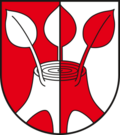 Blasonierung: „Von Rot und Silber gespalten mit einem von drei jungen Trieben beblätterten Baumstumpf in verwechselten Farben.“