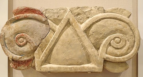 Volutenkapitell aus der alten Stadt Megiddo im nördlichen Israel (Eisen-IIA-Zeit); die Palast­architektur in Megiddo ist nach der High Chronology in die Zeit Salomos zu datieren und vermittelt einen Eindruck von Palast­bauten in Jerusalem (Museum des Oriental Institute der University of Chicago)