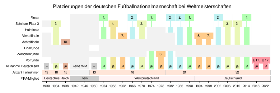 | 2018 | Russland | Vorrunde | Mexiko, Schweden, Südkorea | 22. Platz | Joachim Löw | Fußball-Weltmeisterschaft 2018/Deutschland | Erstmals schied Deutschland bereits in der Vorrunde aus. |