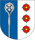 Blasonierung: „Gespalten, rechts in Blau ein aus dem unteren Schildrand hervorkommender silberner Abtstab, links in Silber drei übereinandergestellte schrägliegende vierblättrige rote Rosen mit goldenen Butzen und grünen Kelchblättern.“