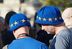 Zwei Personen, die mit Mützen in den EU-Farben am 20. Oktober 2018 für ein zweites Referendum über den EU-Austritt des Vereinigten Königreichs demonstrierten