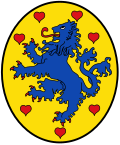 Das Wappen des Fürstentums Lüneburg mit blauem Löwen auf goldenem Grund und roten Herzen.