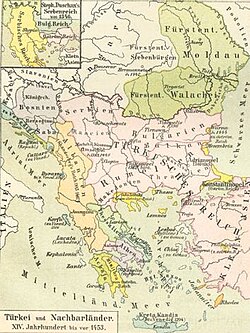 Die territoriale Ausdehnung der Donaufürstentümer Moldau und Walachei im Spätmittelalter (beide Staaten als souverän eingezeichnet, die Moldau allerdings ab 1387 Vasallenstaat des Königreichs Polen in den Grenzen des 14./15. Jahrhunderts)