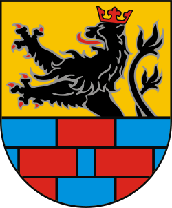 Wappen von Rügen: wachsender Löwe über Stufengiebel