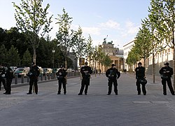 Polizisten sperren das Gelände um das öffentliche Gelöbnis im Jahr 2008 in Berlin ab