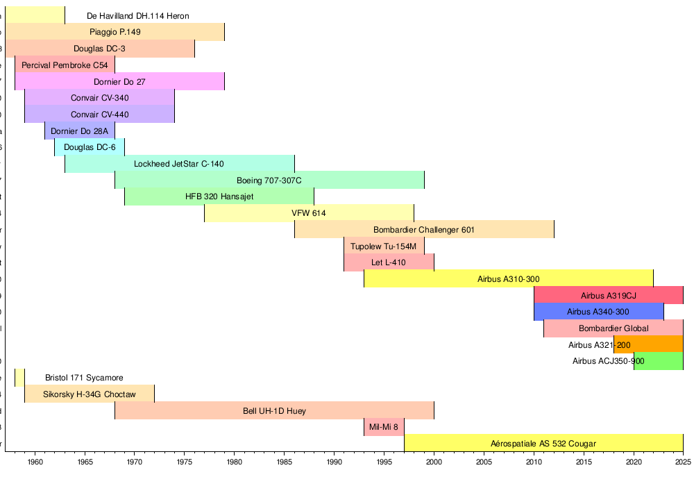 Boeing 707-307C (1968–1999)HFB-320 Hansa Jet, 1984Mil Mi-8S aus NVA-Beständen im Militärhistorischen Museum Gatow (Einsatz von 1993-1997)Airbus A310 VIP