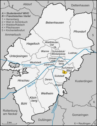 Die nördliche Abgrenzung zum Stadtteil Au/Unterer Wert ist die Reutlinger Straße/B 28 und die Abgrenzung zur Südstadt ist westlich die Marienburger Straße und südlich die Eisenhutstraße.