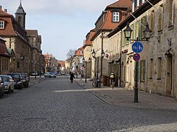 Beginn der Friedrichstraße mit dem Steingraeber-Haus, vorn zwei Burggüter in der Kanzleistraße, rechts daneben das Eckgebäude Friedrichstraße 1
