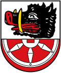 | Blasonierung: „Geteilt von Silber (Weiß) und Rot; oben ein rot bewehrter schwarzer Keilerkopf mit goldenen (gelben) Hauern, unten ein silbernes (weißes) halbes sechsspeichiges Rad (Mainzer Rad).“ | |