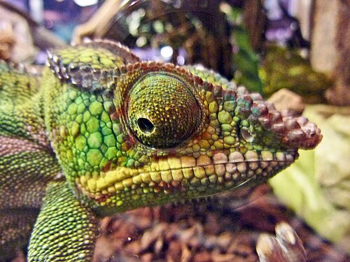 Chamäleonart mit einem Mimikry-Merkmal der Schuppen: vorgetäuschte Zähne zur Abschreckung von möglichen Angreifern. Bei anderen Chamäleonarten sind die simulierten Zähne oft nicht so deutlich ausgeprägt.