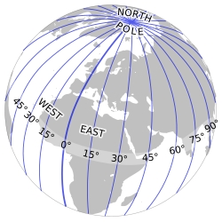 • Orte mit derselben Länge liegen auf demselben Meridian. Ein Meridian verläuft von Pol zu Pol und ist die Hälfte eines Längenkreises.