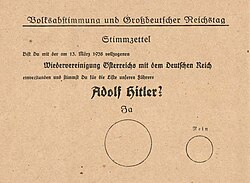 Am 15. März 1938 wurde in vielen Betrieben arbeitsfrei gegeben, damit die Mitarbeiter auf dem Wiener Heldenplatz Hitler zujubeln konnten. Während NS-Gegner bereits in Massen verhaftet wurden und Juden als Untermenschen vom deutschen Herrenvolk nach Belieben schikaniert wurden, erklärte Hitler den Eintritt meiner Heimat in das Deutsche Reich. Den Begriff Österreich verwendete er dabei nicht und vermied ihn auch sonst. Den Anschluss ließ er nachträglich, am 10. April, durch eine Volksabstimmung bestätigen (offizielles Ergebnis: 99,73 % dafür). Bis dahin waren rund 8 % der Wahlberechtigten bereits von der Wahl ausgeschlossen worden (Juden, „Mischlinge“, verhaftete Gegner der Nationalsozialisten).