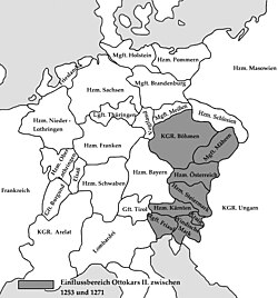 In der Steiermark hingegen wählten die Stände den Sohn des ungarischen Königs zu ihrem Herzog. 1254 einigten sich Ottokar und Bela unter Vermittlung des Papstes auf diese Trennung der ehemaligen Babenbergerländer (Frieden von Ofen), 1261 eroberte Ottokar auch die Steiermark (Schlacht bei Kressenbrunn). 1270 erbte Ottokar Kärnten von Ulrich III., wodurch dessen gemeinsame Zukunft mit Österreich seinen Lauf nahm. Seine Politik war darauf ausgerichtet, den Adel zurückzudrängen und das städtische Bürgertum zu fördern, weswegen er den Wienern bis tief in die Habsburger-Zeit in guter Erinnerung blieb. Seinem Griff nach der königlichen Macht im Heiligen Römischen Reich wurde von Rudolf von Habsburg begegnet, der ihn 1278 in der Schlacht bei Dürnkrut und Jedenspeigen besiegte. Die Habsburger konnten sich daraufhin als Herzöge von Österreich und der Steiermark etablieren und sollten hier bis 1918, also 640 Jahre lang, herrschen.