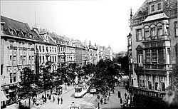 • 1897 sind erstmals auch einige Bebauungen nach der Bahnstraße bis zum Wilhelmplatz (aktuell: Konrad-Adenauer-Platz) nachweisbar, und zwar im Bereich bis Steinstraße (aktuell: Stresemannstraße) und Carlstraße sechs Gebäude, und bis zum Vorplatz des Bahnhofs weitere drei. Diese lagen aber alle auf der Nordseite. Die gesamte Südseite ab Oststraße war zu dieser Zeit noch nicht mit Gebäuden neu bebaut. Weiterhin lagen ab der späteren Pionierstraße bis zum Bahnhofvorplatz noch die „Seifenfabrik R. Dahl“ und das Gelände des Städtischen Fuhrparks.
