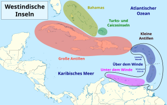 Zusammen mit den Kleinen Antillen, den Turks- und Caicosinseln sowie den Bahamas bilden die Großen Antillen die Westindischen Inseln.