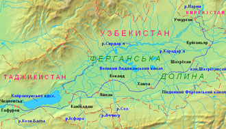 Der Große Ferghanakanal wird flussaufwärts von Uchqoʻrgʻon links aus dem Naryn ausgeleitet und verläuft zunächst im Wesentlichen nach Südosten. Dabei fließt er auch ein kurzes Stück durch kirgisisches Staatsgebiet.