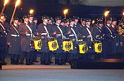 Großer Zapfenstreich auf dem Gelände des Bundesministeriums der Verteidigung in Bonn (2002). Das Bild zeigt gut die Aufstellung der Zapfenstreichformation (von links): Tribüne für den Ehrengast, Position des musikalischen Leiters (jeweils von vier Fackelträgern umrahmt), in der Mitte die zur Tribüne hin ausgerichtete Kernformation mit dem Musikkorps, den beiden Waffenzügen sowie den angeschlossenen Fackelträgern, dahinter mit einigem Abstand die „Perlenkette“ der den Schauplatz rahmenden zusätzlichen Fackelträger.