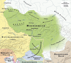 „Trotzdem wird man gut daran tun, nicht von einem ‚Großmährischen Reich‘ zu sprechen. Der Ausdruck, den vor allem die nationalistische Geschichtsschreibung liebt, besitzt keine zeitgenössische Entsprechung, sondern leitet sich von der ‚Großen Moravia‘ des Konstantinos Porphyrogennetos her. Der […] Kaiser meinte jedoch mit ‚groß‘, dass ein Orts- und Ländername entweder ‚älter‘ sei oder ‚ausländisch‘ zum Unterschied von ‚klein‘ im Sinne von ‚reichsangehörig.‘“
