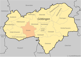 Bis zur Eingemeindung, die am 4. Juli 1964 in Kraft trat, war Grone ein eigenständiges Dorf. Durch das Wachstum der Stadt gingen die beiden Orte ineinander über; zusätzlich zum alten Ortskern gibt es inzwischen die Bereiche Grone-Nord und Grone-Süd. Die Kasseler Landstraße, die die A 7 mit dem Innenstadtbereich von Göttingen verbindet, trennt Grone-Süd von den anderen Teilen.