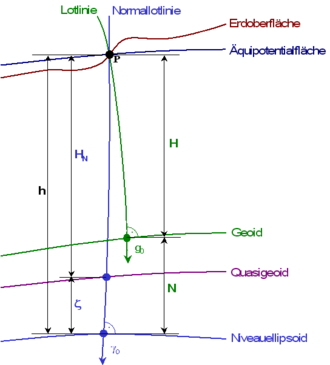 Die Abweichung zwischen der ellipsoidischen Höhe und der Normalhöhe wird Höhenanomalie oder Quasigeoidhöhe ζ{\displaystyle \zeta }  genannt und beträgt in Deutschland zwischen 36 und 50 m: