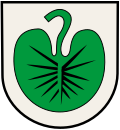 Das Wappen des Ortes Hüls zeigt ein grünes Seerosenblatt mit Stängel auf weißem Grund in einem halbrunden Schild.