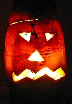 Der Brauch, Kürbisse zum Halloweenfest aufzustellen, stammt aus Irland. Dort lebte einer Sage nach der Bösewicht Jack Oldfield. Dieser fing durch eine List den Teufel ein und wollte ihn nur freilassen, wenn er Jack O fortan nicht mehr in die Quere kommen würde. Nach Jacks Tod kam er aufgrund seiner Taten nicht in den Himmel, aber auch in die Hölle durfte Jack nicht, da er den Teufel betrogen hatte. Doch der Teufel erbarmte sich und schenkte ihm eine Rübe und eine glühende Kohle, damit Jack durch das Dunkel wandern könne. Der Ursprung des beleuchteten Kürbisses war demnach eine beleuchtete Rübe, doch da in den Vereinigten Staaten Kürbisse in großen Mengen zur Verfügung standen, höhlte man stattdessen einen Kürbis aus. Dieser Kürbis war seither als Jack O’Lantern bekannt. Um böse Geister abzuschrecken, schnitt man Fratzen in Kürbisse, die vor dem Haus den Hof beleuchteten.