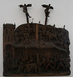 • Kreuztragungs- und Kreuzigungsrelief aus St. Johannis in Brügge (dd um 1530), heute Schleswig, Landesmuseum für Kunst und Kulturgeschichte