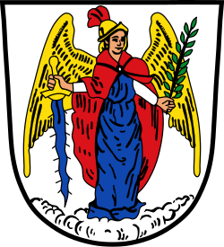 Blasonierung: „In Silber auf silbernen Wolken stehend der Erzengel Michael mit goldenen Flügeln, rotem Mantel und blauem Untergewand, einem goldenen Helm mit rotem Federbusch auf dem Haupt, in der Rechten einen grünen Olivenzweig.“