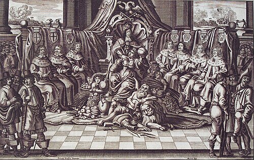 Im Zentrum ist Kaiser Ferdinand III. als Haubt des Reiches im Kreise der Kurfürsten abgebildet. Zu seinen Füßen sitzt eine Frauengestalt als Allegorie des Reiches, erkennbar am Insigne des Reichsapfels. Die sie umgebenden Früchte symbolisieren die Hoffnung auf neuen Wohlstand nach dem Ende des Dreißigjährigen Krieges.