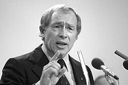 Geißler bei einer Pressekonferenz zu den Koalitionsverhandlungen zwischen CDU/CSU und FDP am 12. Februar 1987