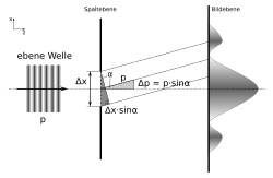 Bei der von Heisenberg ursprünglich publizierten Variante der Unbestimmtheitsrelation wird der Begriff der Unschärfe von Ort und Impuls nicht immer durch die statistische Streuung dargestellt. Ein Beispiel dafür ist das häufig diskutierte Gedankenexperiment, in dem mit Hilfe des Einfachspaltes Ort und Impuls von Teilchen bestimmt werden soll: ein breiter Strahl parallel fliegender Elektronen mit gleichem Impuls trifft auf einen Schirm mit einem Spalt der Breite (siehe Abbildung rechts). Beim Durchtritt durch den Spalt ist die Ortskoordinate der Elektronen (in Richtung quer zum Spalt) bis auf die Unsicherheit bekannt. Die Ausblendung verursacht eine Beugung des Strahls, wobei nach dem huygensschen Prinzip von allen Punkten des Spalts Elementarwellen ausgehen. Dies führt nach dem Durchtritt durch den Spalt zu einer Aufweitung des Strahls, d. h. für jedes einzelne Elektron zu einer Ablenkung um einen gewissen Winkel .
