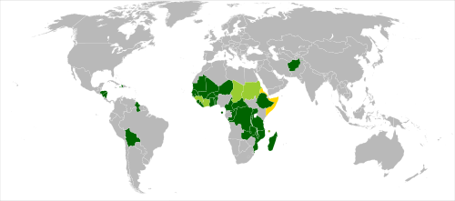 Afghanistan, Äthiopien, Benin, Bolivien, Burkina Faso, Burundi, Demokratische Republik Kongo, Gambia, Ghana, Guinea-Bissau, Guyana, Haiti, Honduras, Kamerun, Liberia, Madagaskar, Malawi, Mali, Mauretanien, Mosambik, Nicaragua, Niger, Republik Kongo, Ruanda, Sambia, São Tomé und Príncipe, Senegal, Sierra Leone, Tansania, Togo, Uganda, Zentralafrikanische Republik