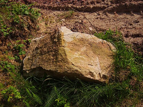 Einzelner, kräftig angewitterter Block aus Ibbenbürener Sandstein mit gut erkennbarer Horizontalschichtung. Am rechten oberen Rand des Blocks liegt relativ frisches, helles Material frei.