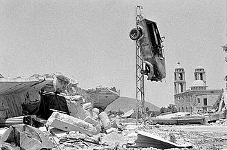 ![]() Trümmer mit sowjetischem GAZ-69 vor Georgskirche im syrischen Quneitra auf den Golanhöhen | |||||||||||||||||
