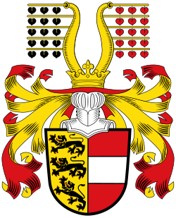 „Gespalten von Gold und Rot, vorne pfahlweise drei schreitende rotbezungte und -bewehrte schwarze Löwen, hinten ein silberner Balken. Auf dem gekrönten Spangenhelm mit rot-goldenen Decken zwei goldene Büffelhörner, außen mit je fünf goldenen Stäbchen besteckt, an denen rechts je drei herabhängende schwarze, links je drei rote Lindenblätter.“