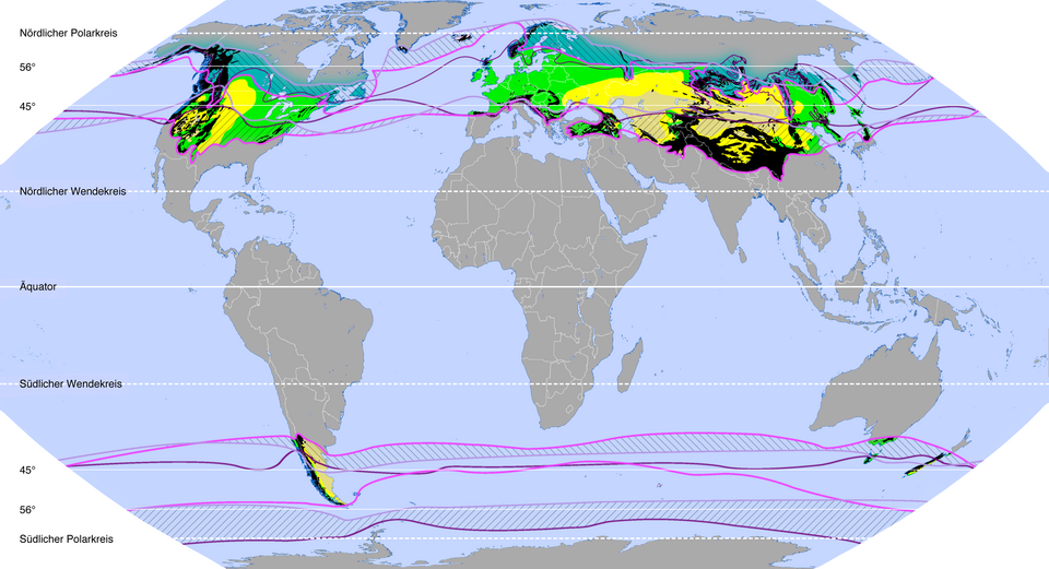 12. Abgeleitet aus Frostverteilung nach Larcher bzw. Larcher & Bauer in Jörg S. Pfadenhauer, Frank A. Klötzli: Vegetation der Erde. Springer Spektrum, Berlin/Heidelberg 2014, ISBN 978-3-642-41949-2, S. 46, Abb. 1–24, sowie: Jürgen Schultz: Die Ökozonen der Erde. 4., völlig neu bearbeitete Auflage, Ulmer UTB, Stuttgart 2008, ISBN 978-3-8252-1514-9. S. 247, Abb. 12.3.