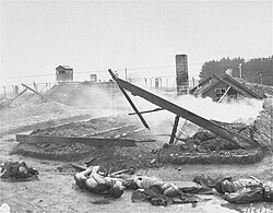 Leichen ermordeter jüdischer KZ-Zwangsarbeiter liegen auf der Straße vor den schwelenden Ruinen von Baracken, die von der SS bei der Evakuierung von Hurlach (KZ-Außenlager Kaufering IV – Hurlach) dem Erdboden gleichgemacht wurden. (Foto 28. April 1945. National Archives and Records Administration, College Park)