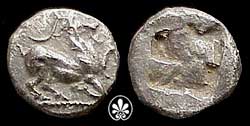 Trihemiobole aus Aigai, vor 500 v. Chr. Das Motiv wird mit dem Karanos-Orakel in Verbindung gebracht.