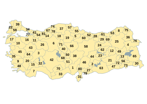 Die Türkei ist in 81 Provinzen eingeteilt. Von 01 bis 67 ist die Nummerierung durchgehend alphabetisch geordnet. Des Weiteren gibt es Unregelmäßigkeiten in der alphabetischen Ordnung durch Änderung von Provinznamen: 33 – Mersin (bis 2002 İçel), 46 – Kahramanmaraş (bis 1973 Maraş) und 63 – Şanlıurfa (bis 1984 Urfa). Später hinzugekommene Provinzen erhielten die Kennnummern von 68 bis 81.
